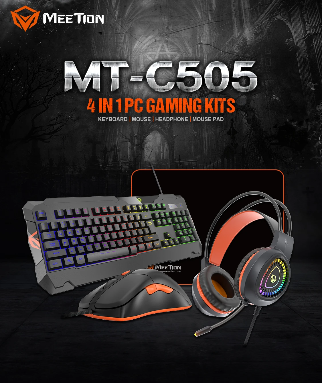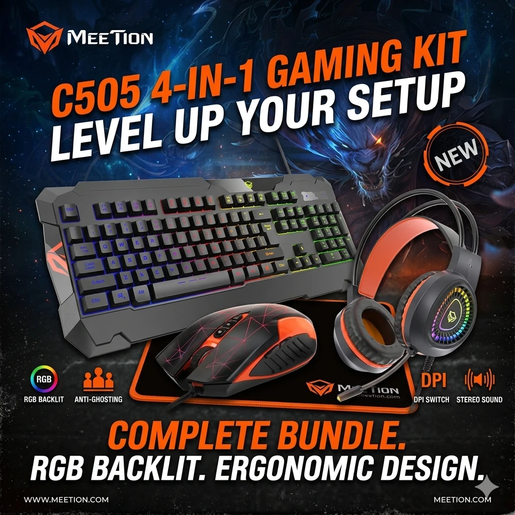 Elevate your desktop setup with the Meetion C505, a comprehensive 4-in-1 gaming kit designed to provide everything you need for an immersive and comfortable gaming experience. Ditch the mismatched peripherals and step into a unified, RGB-backlit battle station.